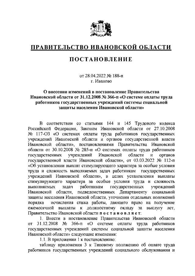 Постановление Правительства Ивановской области от 28.04.2022 N 188-п "О внесении изменений в постановление Правительства Ивановской области от 31.12.2008 N 366-п "О системе оплаты труда работников государственных учреждений системы социальной защиты населения Ивановской области"