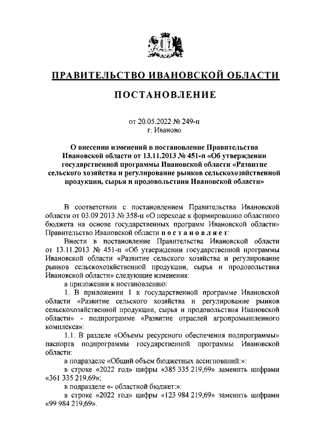 Постановление Правительства Ивановской области от 20.05.2022 N 249-п "О внесении изменений в постановление Правительства Ивановской области от 13.11.2013 N 451-п "Об утверждении государственной программы Ивановской области "Развитие сельского хозяйства и регулирование рынков сельскохозяйственной продукции, сырья и продовольствия Ивановской области"