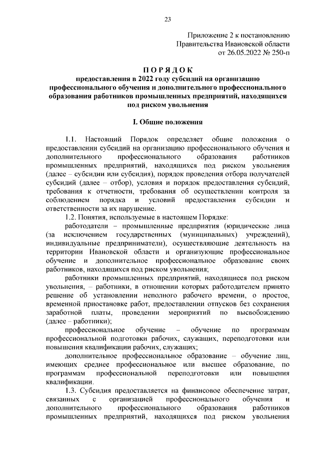Постановление Правительства Ивановской области от 26.05.2022 N 250-п "О реализации в 2022 году отдельных мероприятий, направленных на снижение напряженности на рынке труда Ивановской области" (вместе с "Порядком предоставления в 2022 году субсидий на реализацию дополнительных мероприятий, направленных на снижение напряженности на рынке труда Ивановской области", "Порядком предоставления в 2022 году субсидий на организацию профессионального обучения и дополнительного профессионального образования работников промышленных предприятий, находящихся под риском увольнения")