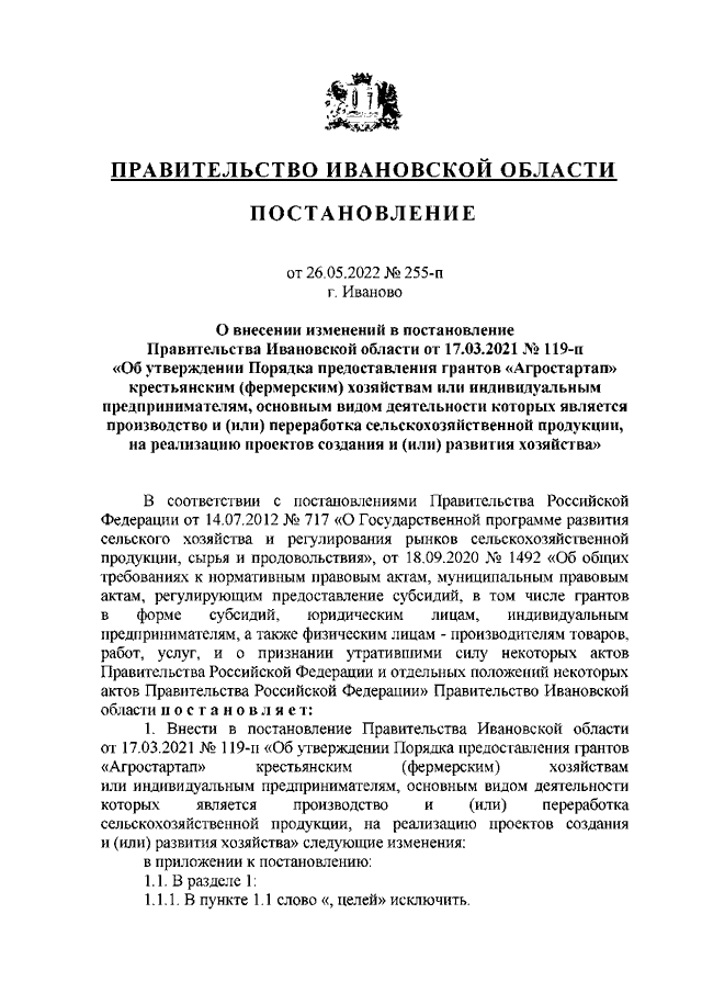 Постановление Правительства Ивановской области от 26.05.2022 N 255-п "О внесении изменений в постановление Правительства Ивановской области от 17.03.2021 N 119-п "Об утверждении Порядка предоставления грантов "Агростартап" крестьянским (фермерским) хозяйствам или индивидуальным предпринимателям, основным видом деятельности которых является производство и (или) переработка сельскохозяйственной продукции, на реализацию проектов создания и (или) развития хозяйства"