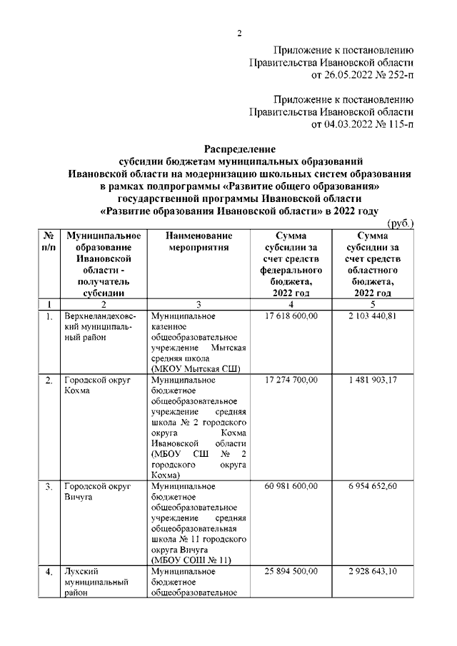 Постановление Правительства Ивановской области от 26.05.2022 N 252-п "О внесении изменения в постановление Правительства Ивановской области от 04.03.2022 N 115-п "О распределении субсидии бюджетам муниципальных образований Ивановской области на модернизацию школьных систем образования в рамках подпрограммы "Развитие общего образования" государственной программы Ивановской области "Развитие образования Ивановской области" в 2022 году"