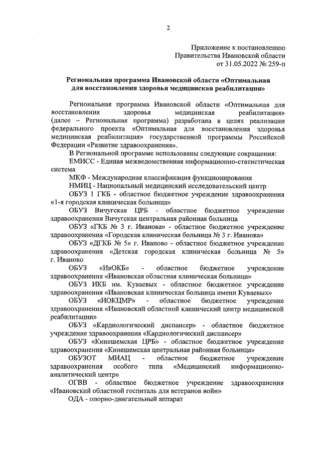 Постановление Правительства Ивановской области от 31.05.2022 N 259-п "Об утверждении Региональной программы Ивановской области "Оптимальная для восстановления здоровья медицинская реабилитация"