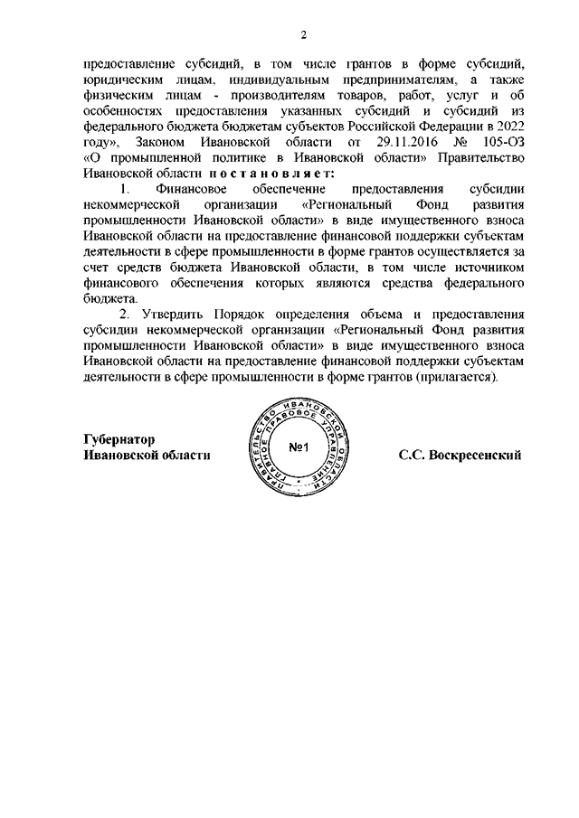 Постановление Правительства Ивановской области от 06.06.2022 N 261-п "Об утверждении Порядка определения объема и предоставления субсидии некоммерческой организации "Региональный Фонд развития промышленности Ивановской области" в виде имущественного взноса Ивановской области на предоставление финансовой поддержки субъектам деятельности в сфере промышленности в форме грантов"