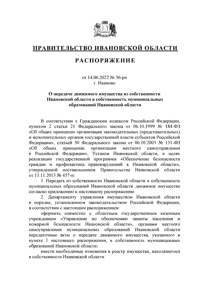Распоряжение Правительства Ивановской области от 14.06.2022 N 56-рп "О передаче движимого имущества из собственности Ивановской области в собственность муниципальных образований Ивановской области"