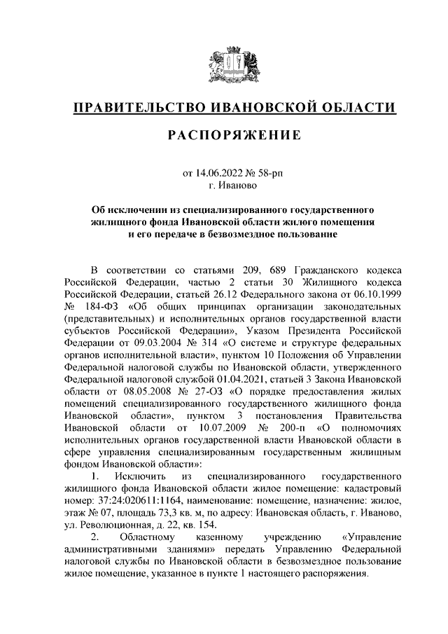 Распоряжение Правительства Ивановской области от 14.06.2022 N 58-рп "Об исключении из специализированного государственного жилищного фонда Ивановской области жилого помещения и его передаче в безвозмездное пользование"