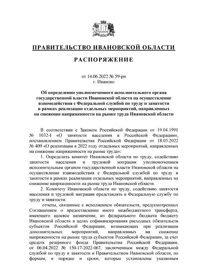 Распоряжение Правительства Ивановской области от 14.06.2022 N 59-рп "Об определении уполномоченного исполнительного органа государственной власти Ивановской области на осуществление взаимодействия с Федеральной службой по труду и занятости в рамках реализации отдельных мероприятий, направленных на снижение напряженности на рынке труда Ивановской области"