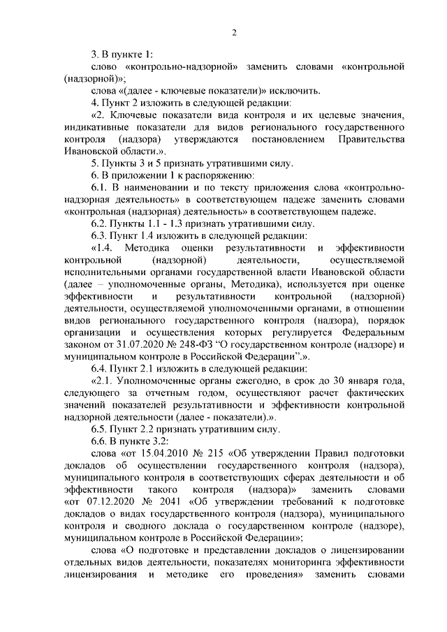 Распоряжение Правительства Ивановской области от 14.06.2022 N 62-рп "О внесении изменений в распоряжение Правительства Ивановской области от 17.02.2020 N 16-рп "Об утверждении Методики оценки результативности и эффективности контрольно-надзорной деятельности, осуществляемой исполнительными органами государственной власти Ивановской области, и Перечня ключевых показателей результативности контрольно-надзорной деятельности, осуществляемой исполнительными органами государственной власти Ивановской области"