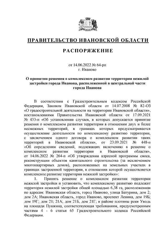 Распоряжение Правительства Ивановской области от 14.06.2022 N 64-рп "О принятии решения о комплексном развитии территории нежилой застройки города Иванова, расположенной в центральной части города Иванова"