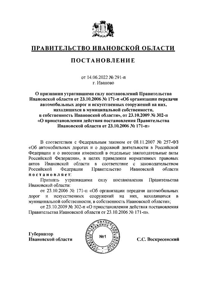 Постановление Правительства Ивановской области от 14.06.2022 N 291-п "О признании утратившими силу постановлений Правительства Ивановской области от 23.10.2006 N 171-п "Об организации передачи автомобильных дорог и искусственных сооружений на них, находящихся в муниципальной собственности, в собственность Ивановской области", от 23.10.2009 N 302-п "О приостановлении действия постановления Правительства Ивановской области от 23.10.2006 N 171-п"