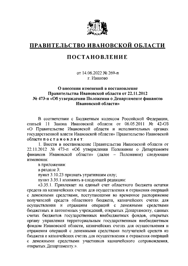 Постановление Правительства Ивановской области от 14.06.2022 N 269-п "О внесении изменений в постановление Правительства Ивановской области от 22.11.2012 N 473-п "Об утверждении Положения о Департаменте финансов Ивановской области"