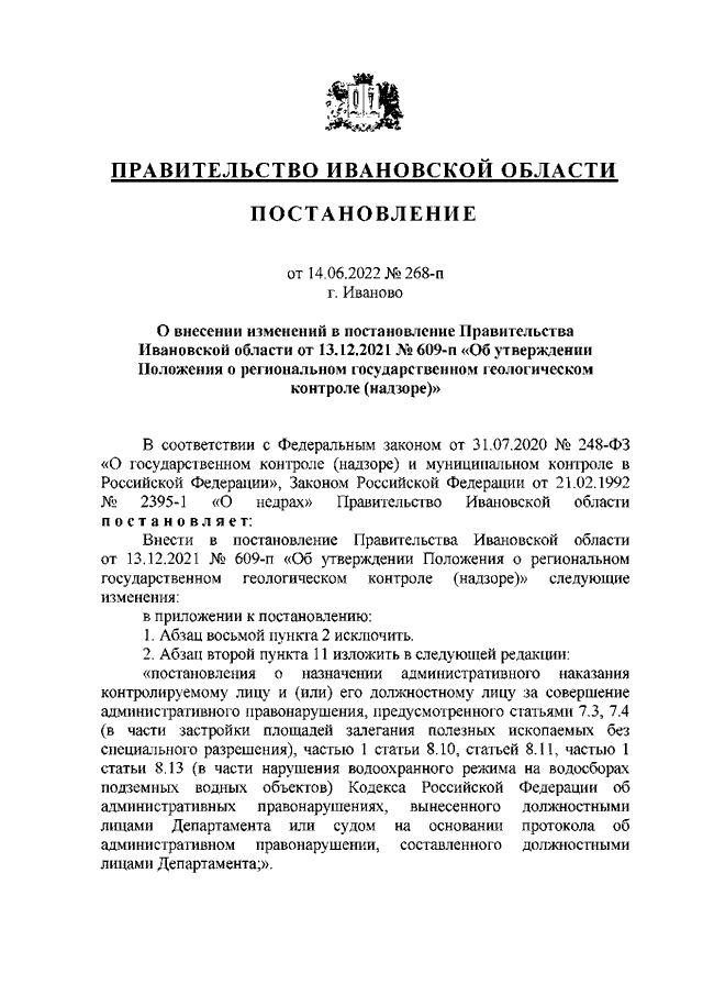 Постановление Правительства Ивановской области от 14.06.2022 N 268-п "О внесении изменений в постановление Правительства Ивановской области от 13.12.2021 N 609-п "Об утверждении Положения о региональном государственном геологическом контроле (надзоре)"