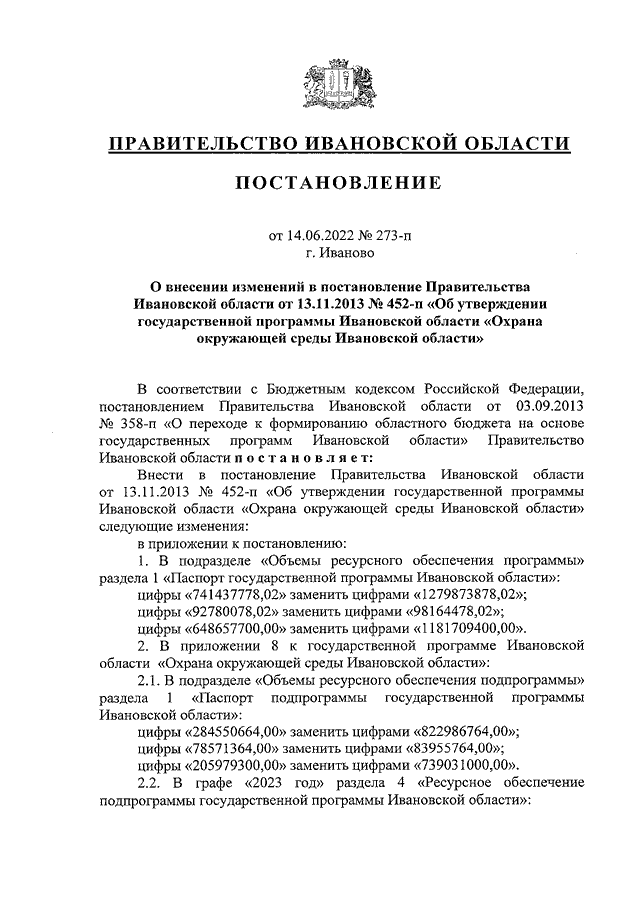 Постановление Правительства Ивановской области от 14.06.2022 N 273-п "О внесении изменений в постановление Правительства Ивановской области от 13.11.2013 N 452-п "Об утверждении государственной программы Ивановской области "Охрана окружающей среды Ивановской области"