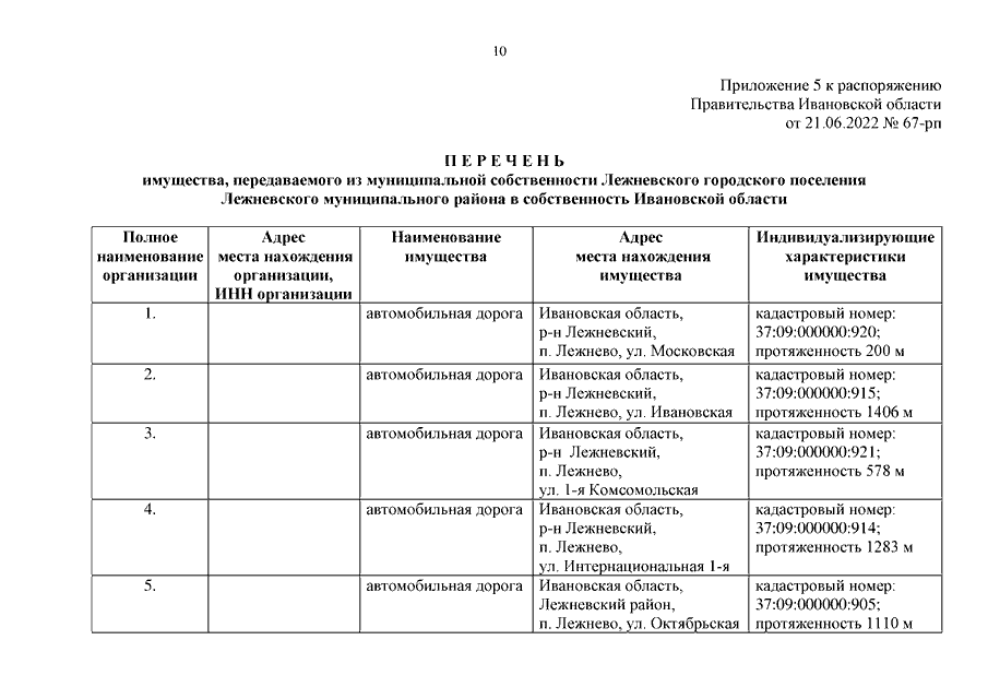 Распоряжение Правительства Ивановской области от 21.06.2022 N 67-рп "О передаче автомобильных дорог и о внесении изменения в распоряжение Правительства Ивановской области от 02.07.2008 N 222-рп "Об утверждении перечня автомобильных дорог общего пользования регионального или межмуниципального значения Ивановской области" (вместе с "Перечнем имущества, передаваемого из муниципальной собственности городского округа Кинешма в собственность Ивановской области", "Перечнем имущества, передаваемого из муниципальной собственности Заволжского муниципального района в собственность Ивановской области", "Перечнем имущества, передаваемого из муниципальной собственности Комсомольского муниципального района в собственность Ивановской области", "Перечнем имущества, передаваемого из муниципальной собственности Комсомольского городского поселения Комсомольского муниципального района в собственность Ивановской области", "Перечнем имущества, передаваемого из муниципальной собственности Лежневского городского поселения Лежневского муниципального района в собственность Ивановской области", "Перечнем имущества, передаваемого из муниципальной собственности Наволокского городского поселения Кинешемского муниципального района в собственность Ивановской области", "Перечнем имущества, передаваемого из муниципальной собственности Плесского городского поселения Приволжского муниципального района в собственность Ивановской области", "Перечнем имущества, передаваемого из муниципальной собственности Савинского городского поселения Савинского муниципального района в собственность Ивановской области", "Перечнем имущества, передаваемого из муниципальной собственности Фурмановского муниципального района в собственность Ивановской области", "Перечнем имущества, передаваемого из собственности Ивановской области в муниципальную собственность Верхнеландеховского муниципального района", "Перечнем имущества, передаваемого из собственности Ивановской области в муниципальную собственность Заволжского муниципального района", "Перечнем имущества, передаваемого из собственности Ивановской области в муниципальную собственность Кинешемского муниципального района", "Перечнем имущества, передаваемого из собственности Ивановской области в муниципальную собственность Лухского муниципального района", "Перечнем имущества, передаваемого из собственности Ивановской области в муниципальную собственность Палехского муниципального района", "Перечнем имущества, передаваемого из собственности Ивановской области в муниципальную собственность Пучежского муниципального района", "Перечнем имущества, передаваемого из собственности Ивановской области в муниципальную собственность муниципального образования "Родниковский муниципальный район", "Перечнем имущества, передаваемого из собственности Ивановской области в муниципальную собственность Савинского муниципального района", "Перечнем имущества, передаваемого из собственности Ивановской области в муниципальную собственность Шуйского муниципального района", "Перечнем имущества, передаваемого из собственности Ивановской области в муниципальную собственность Южского муниципального района")