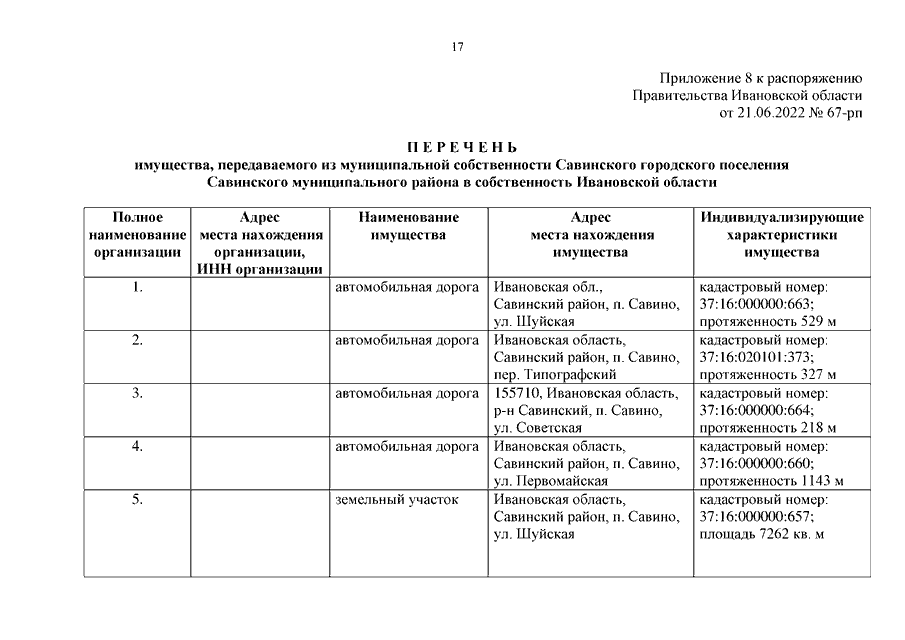 Распоряжение Правительства Ивановской области от 21.06.2022 N 67-рп "О передаче автомобильных дорог и о внесении изменения в распоряжение Правительства Ивановской области от 02.07.2008 N 222-рп "Об утверждении перечня автомобильных дорог общего пользования регионального или межмуниципального значения Ивановской области" (вместе с "Перечнем имущества, передаваемого из муниципальной собственности городского округа Кинешма в собственность Ивановской области", "Перечнем имущества, передаваемого из муниципальной собственности Заволжского муниципального района в собственность Ивановской области", "Перечнем имущества, передаваемого из муниципальной собственности Комсомольского муниципального района в собственность Ивановской области", "Перечнем имущества, передаваемого из муниципальной собственности Комсомольского городского поселения Комсомольского муниципального района в собственность Ивановской области", "Перечнем имущества, передаваемого из муниципальной собственности Лежневского городского поселения Лежневского муниципального района в собственность Ивановской области", "Перечнем имущества, передаваемого из муниципальной собственности Наволокского городского поселения Кинешемского муниципального района в собственность Ивановской области", "Перечнем имущества, передаваемого из муниципальной собственности Плесского городского поселения Приволжского муниципального района в собственность Ивановской области", "Перечнем имущества, передаваемого из муниципальной собственности Савинского городского поселения Савинского муниципального района в собственность Ивановской области", "Перечнем имущества, передаваемого из муниципальной собственности Фурмановского муниципального района в собственность Ивановской области", "Перечнем имущества, передаваемого из собственности Ивановской области в муниципальную собственность Верхнеландеховского муниципального района", "Перечнем имущества, передаваемого из собственности Ивановской области в муниципальную собственность Заволжского муниципального района", "Перечнем имущества, передаваемого из собственности Ивановской области в муниципальную собственность Кинешемского муниципального района", "Перечнем имущества, передаваемого из собственности Ивановской области в муниципальную собственность Лухского муниципального района", "Перечнем имущества, передаваемого из собственности Ивановской области в муниципальную собственность Палехского муниципального района", "Перечнем имущества, передаваемого из собственности Ивановской области в муниципальную собственность Пучежского муниципального района", "Перечнем имущества, передаваемого из собственности Ивановской области в муниципальную собственность муниципального образования "Родниковский муниципальный район", "Перечнем имущества, передаваемого из собственности Ивановской области в муниципальную собственность Савинского муниципального района", "Перечнем имущества, передаваемого из собственности Ивановской области в муниципальную собственность Шуйского муниципального района", "Перечнем имущества, передаваемого из собственности Ивановской области в муниципальную собственность Южского муниципального района")