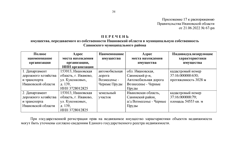 Распоряжение Правительства Ивановской области от 21.06.2022 N 67-рп "О передаче автомобильных дорог и о внесении изменения в распоряжение Правительства Ивановской области от 02.07.2008 N 222-рп "Об утверждении перечня автомобильных дорог общего пользования регионального или межмуниципального значения Ивановской области" (вместе с "Перечнем имущества, передаваемого из муниципальной собственности городского округа Кинешма в собственность Ивановской области", "Перечнем имущества, передаваемого из муниципальной собственности Заволжского муниципального района в собственность Ивановской области", "Перечнем имущества, передаваемого из муниципальной собственности Комсомольского муниципального района в собственность Ивановской области", "Перечнем имущества, передаваемого из муниципальной собственности Комсомольского городского поселения Комсомольского муниципального района в собственность Ивановской области", "Перечнем имущества, передаваемого из муниципальной собственности Лежневского городского поселения Лежневского муниципального района в собственность Ивановской области", "Перечнем имущества, передаваемого из муниципальной собственности Наволокского городского поселения Кинешемского муниципального района в собственность Ивановской области", "Перечнем имущества, передаваемого из муниципальной собственности Плесского городского поселения Приволжского муниципального района в собственность Ивановской области", "Перечнем имущества, передаваемого из муниципальной собственности Савинского городского поселения Савинского муниципального района в собственность Ивановской области", "Перечнем имущества, передаваемого из муниципальной собственности Фурмановского муниципального района в собственность Ивановской области", "Перечнем имущества, передаваемого из собственности Ивановской области в муниципальную собственность Верхнеландеховского муниципального района", "Перечнем имущества, передаваемого из собственности Ивановской области в муниципальную собственность Заволжского муниципального района", "Перечнем имущества, передаваемого из собственности Ивановской области в муниципальную собственность Кинешемского муниципального района", "Перечнем имущества, передаваемого из собственности Ивановской области в муниципальную собственность Лухского муниципального района", "Перечнем имущества, передаваемого из собственности Ивановской области в муниципальную собственность Палехского муниципального района", "Перечнем имущества, передаваемого из собственности Ивановской области в муниципальную собственность Пучежского муниципального района", "Перечнем имущества, передаваемого из собственности Ивановской области в муниципальную собственность муниципального образования "Родниковский муниципальный район", "Перечнем имущества, передаваемого из собственности Ивановской области в муниципальную собственность Савинского муниципального района", "Перечнем имущества, передаваемого из собственности Ивановской области в муниципальную собственность Шуйского муниципального района", "Перечнем имущества, передаваемого из собственности Ивановской области в муниципальную собственность Южского муниципального района")