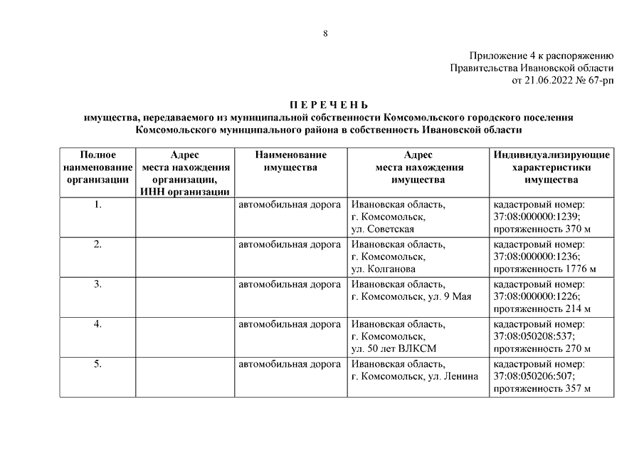 Распоряжение Правительства Ивановской области от 21.06.2022 N 67-рп "О передаче автомобильных дорог и о внесении изменения в распоряжение Правительства Ивановской области от 02.07.2008 N 222-рп "Об утверждении перечня автомобильных дорог общего пользования регионального или межмуниципального значения Ивановской области" (вместе с "Перечнем имущества, передаваемого из муниципальной собственности городского округа Кинешма в собственность Ивановской области", "Перечнем имущества, передаваемого из муниципальной собственности Заволжского муниципального района в собственность Ивановской области", "Перечнем имущества, передаваемого из муниципальной собственности Комсомольского муниципального района в собственность Ивановской области", "Перечнем имущества, передаваемого из муниципальной собственности Комсомольского городского поселения Комсомольского муниципального района в собственность Ивановской области", "Перечнем имущества, передаваемого из муниципальной собственности Лежневского городского поселения Лежневского муниципального района в собственность Ивановской области", "Перечнем имущества, передаваемого из муниципальной собственности Наволокского городского поселения Кинешемского муниципального района в собственность Ивановской области", "Перечнем имущества, передаваемого из муниципальной собственности Плесского городского поселения Приволжского муниципального района в собственность Ивановской области", "Перечнем имущества, передаваемого из муниципальной собственности Савинского городского поселения Савинского муниципального района в собственность Ивановской области", "Перечнем имущества, передаваемого из муниципальной собственности Фурмановского муниципального района в собственность Ивановской области", "Перечнем имущества, передаваемого из собственности Ивановской области в муниципальную собственность Верхнеландеховского муниципального района", "Перечнем имущества, передаваемого из собственности Ивановской области в муниципальную собственность Заволжского муниципального района", "Перечнем имущества, передаваемого из собственности Ивановской области в муниципальную собственность Кинешемского муниципального района", "Перечнем имущества, передаваемого из собственности Ивановской области в муниципальную собственность Лухского муниципального района", "Перечнем имущества, передаваемого из собственности Ивановской области в муниципальную собственность Палехского муниципального района", "Перечнем имущества, передаваемого из собственности Ивановской области в муниципальную собственность Пучежского муниципального района", "Перечнем имущества, передаваемого из собственности Ивановской области в муниципальную собственность муниципального образования "Родниковский муниципальный район", "Перечнем имущества, передаваемого из собственности Ивановской области в муниципальную собственность Савинского муниципального района", "Перечнем имущества, передаваемого из собственности Ивановской области в муниципальную собственность Шуйского муниципального района", "Перечнем имущества, передаваемого из собственности Ивановской области в муниципальную собственность Южского муниципального района")
