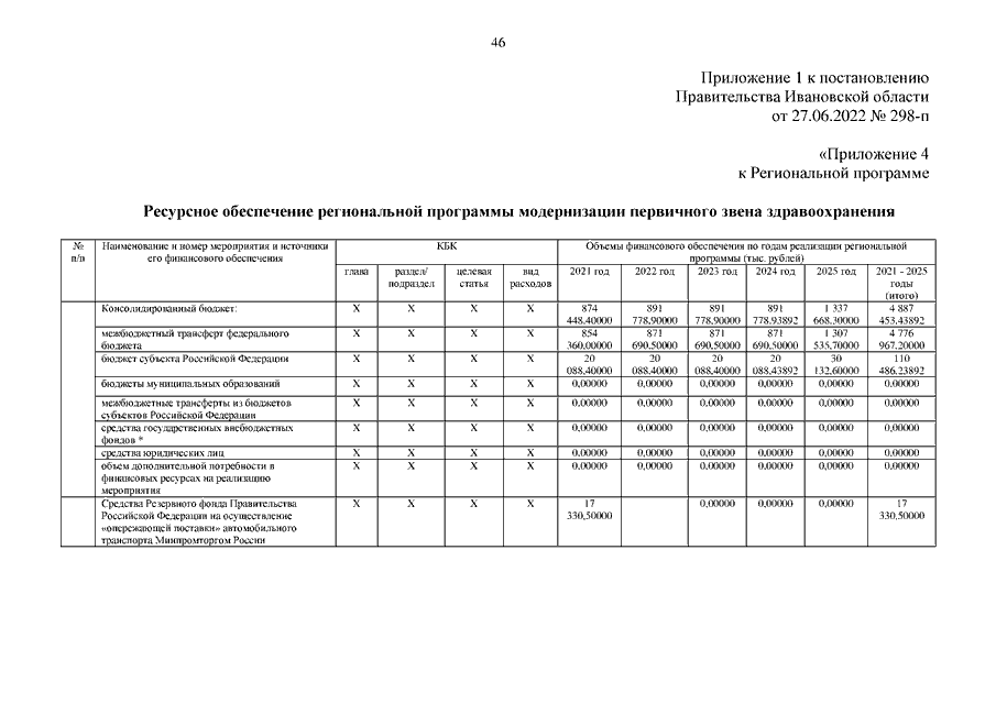 Постановление Правительства Ивановской области от 27.06.2022 N 298-п "О внесении изменений в постановление Правительства Ивановской области от 15.12.2020 N 626-п "Об утверждении Региональной программы модернизации первичного звена здравоохранения Ивановской области на 2021 - 2025 годы"