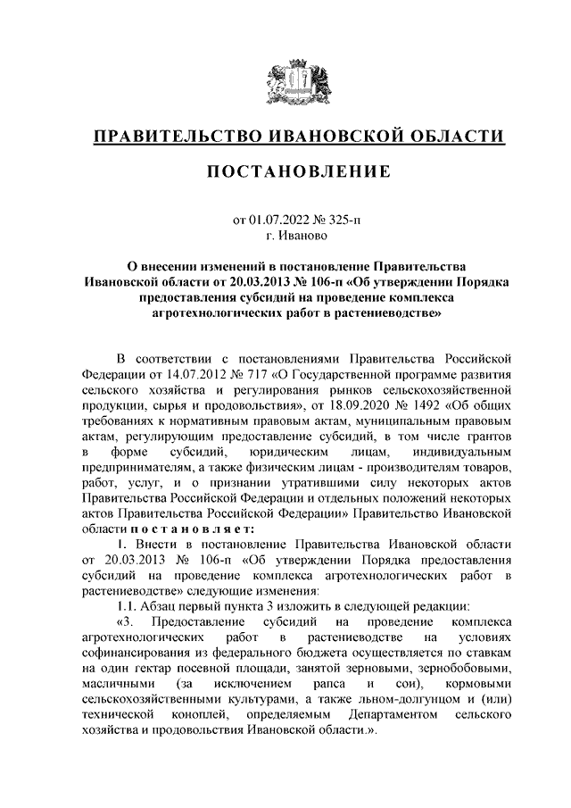 Постановление Правительства Ивановской области от 01.07.2022 N 325-п "О внесении изменений в постановление Правительства Ивановской области от 20.03.2013 N 106-п "Об утверждении Порядка предоставления субсидий на проведение комплекса агротехнологических работ в растениеводстве"