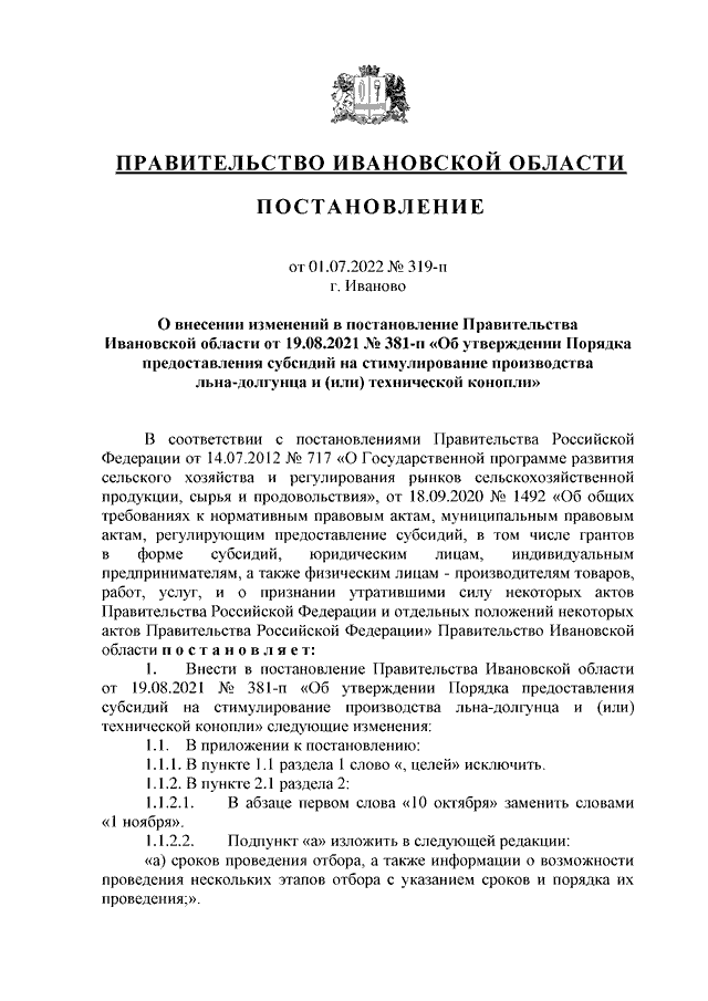 Постановление Правительства Ивановской области от 01.07.2022 N 319-п "О внесении изменений в постановление Правительства Ивановской области от 19.08.2021 N 381-п "Об утверждении Порядка предоставления субсидий на стимулирование производства льна-долгунца и (или) технической конопли"