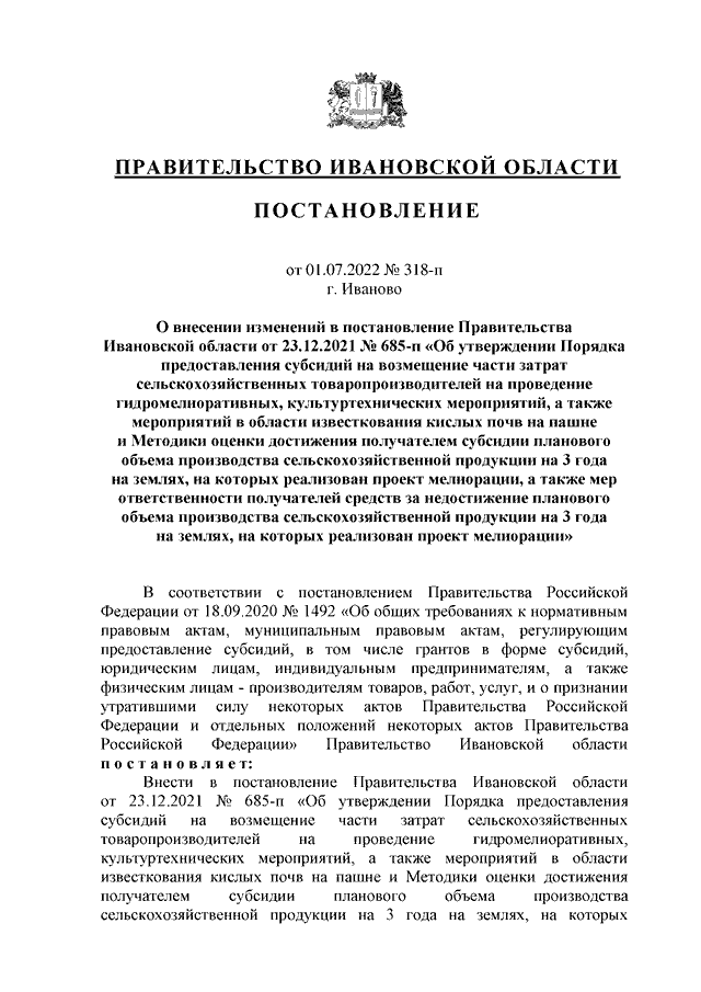 Постановление Правительства Ивановской области от 01.07.2022 N 318-п "О внесении изменений в постановление Правительства Ивановской области от 23.12.2021 N 685-п "Об утверждении Порядка предоставления субсидий на возмещение части затрат сельскохозяйственных товаропроизводителей на проведение гидромелиоративных, культуртехнических мероприятий, а также мероприятий в области известкования кислых почв на пашне и Методики оценки достижения получателем субсидии планового объема производства сельскохозяйственной продукции на 3 года на землях, на которых реализован проект мелиорации, а также мер ответственности получателей средств за недостижение планового объема производства сельскохозяйственной продукции на 3 года на землях, на которых реализован проект мелиорации"