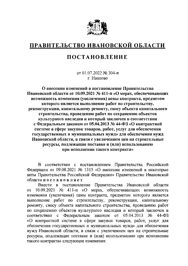 Постановление Правительства Ивановской области от 01.07.2022 N 304-п "О внесении изменений в постановление Правительства Ивановской области от 10.09.2021 N 411-п "О мерах, обеспечивающих возможность изменения (увеличения) цены контракта, предметом которого является выполнение работ по строительству, реконструкции, капитальному ремонту, сносу объекта капитального строительства, проведению работ по сохранению объектов культурного наследия и который заключен в соответствии с Федеральным законом от 05.04.2013 N 44-ФЗ "О контрактной системе в сфере закупок товаров, работ, услуг для обеспечения государственных и муниципальных нужд" для обеспечения нужд Ивановской области, в связи с увеличением цен на строительные ресурсы, подлежащие поставке и (или) использованию при исполнении такого контракта"