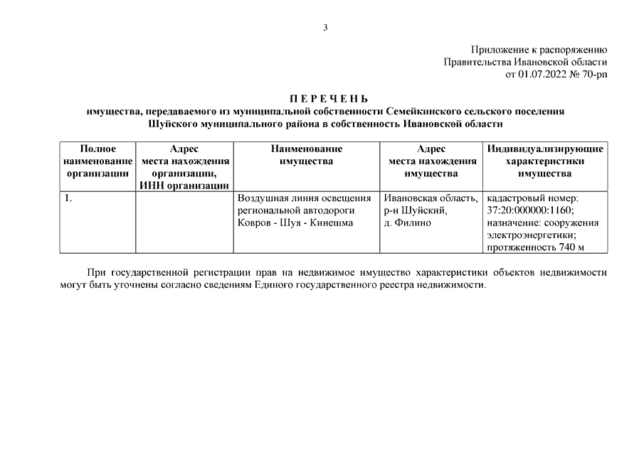 Распоряжение Правительства Ивановской области от 01.07.2022 N 70-рп "О передаче из муниципальной собственности Семейкинского сельского поселения Шуйского муниципального района в собственность Ивановской области сооружения электроэнергетики"
