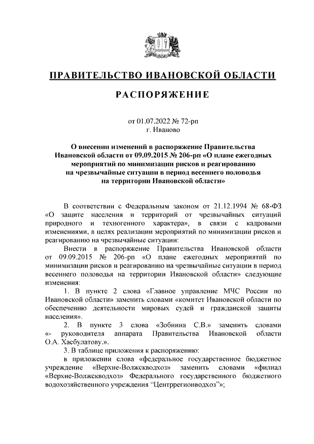 Распоряжение Правительства Ивановской области от 01.07.2022 N 72-рп "О внесении изменений в распоряжение Правительства Ивановской области от 09.09.2015 N 206-рп "О плане ежегодных мероприятий по минимизации рисков и реагированию на чрезвычайные ситуации в период весеннего половодья на территории Ивановской области"