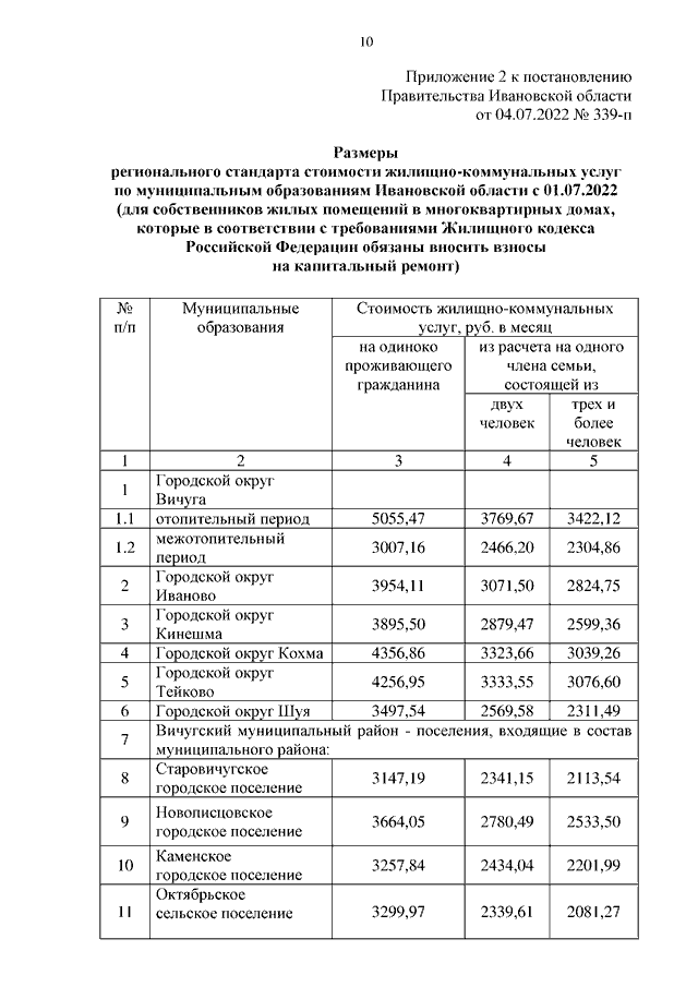 Постановление Правительства Ивановской области от 04.07.2022 N 339-п "Об установлении размеров региональных стандартов стоимости жилищно-коммунальных услуг"