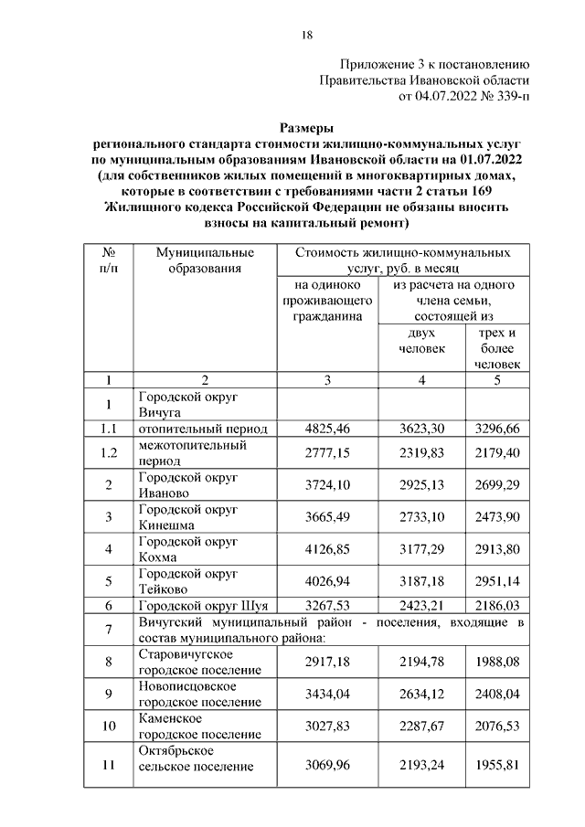 Постановление Правительства Ивановской области от 04.07.2022 N 339-п "Об установлении размеров региональных стандартов стоимости жилищно-коммунальных услуг"