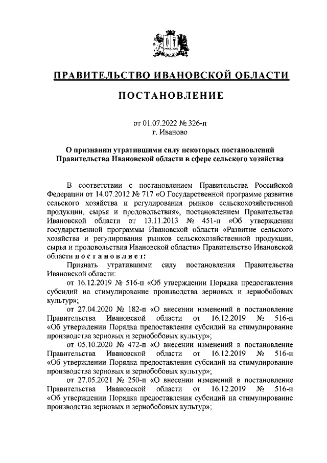 Постановление Правительства Ивановской области от 01.07.2022 N 326-п "О признании утратившими силу некоторых постановлений Правительства Ивановской области в сфере сельского хозяйства"
