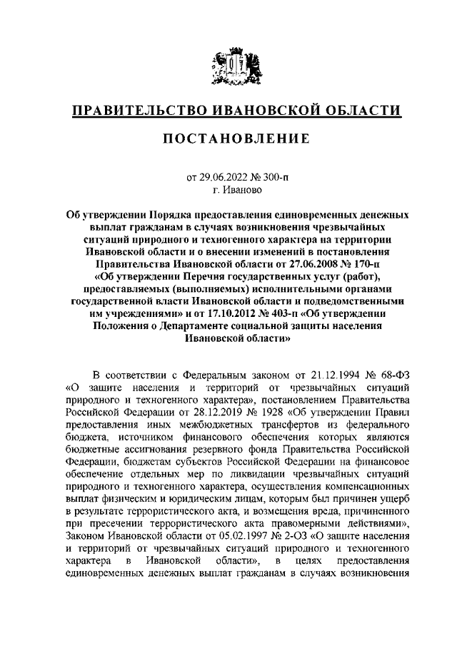 Постановление Правительства Ивановской области от 29.06.2022 N 300-п "Об утверждении Порядка предоставления единовременных денежных выплат гражданам в случаях возникновения чрезвычайных ситуаций природного и техногенного характера на территории Ивановской области и о внесении изменений в постановления Правительства Ивановской области от 27.06.2008 N 170-п "Об утверждении Перечня государственных услуг (работ), предоставляемых (выполняемых) исполнительными органами государственной власти Ивановской области и подведомственными им учреждениями" и от 17.10.2012 N 403-п "Об утверждении Положения о Департаменте социальной защиты населения Ивановской области"