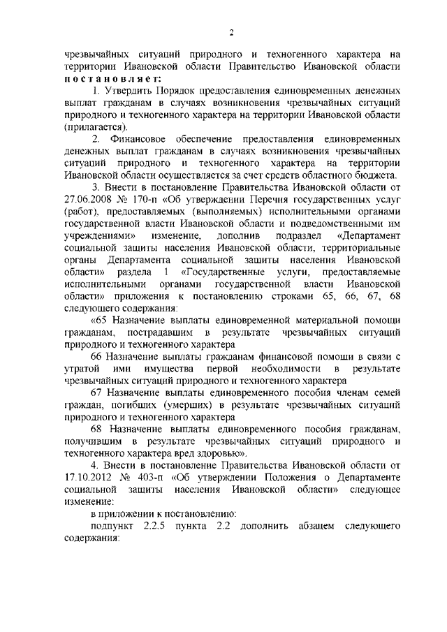 Постановление Правительства Ивановской области от 29.06.2022 N 300-п "Об утверждении Порядка предоставления единовременных денежных выплат гражданам в случаях возникновения чрезвычайных ситуаций природного и техногенного характера на территории Ивановской области и о внесении изменений в постановления Правительства Ивановской области от 27.06.2008 N 170-п "Об утверждении Перечня государственных услуг (работ), предоставляемых (выполняемых) исполнительными органами государственной власти Ивановской области и подведомственными им учреждениями" и от 17.10.2012 N 403-п "Об утверждении Положения о Департаменте социальной защиты населения Ивановской области"