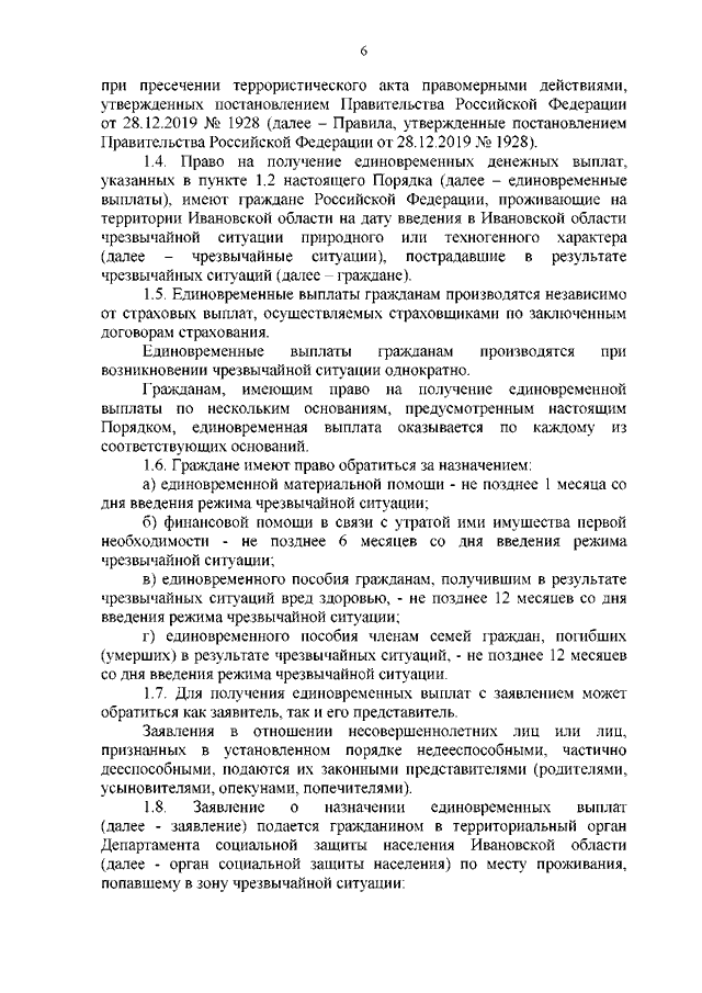 Постановление Правительства Ивановской области от 29.06.2022 N 300-п "Об утверждении Порядка предоставления единовременных денежных выплат гражданам в случаях возникновения чрезвычайных ситуаций природного и техногенного характера на территории Ивановской области и о внесении изменений в постановления Правительства Ивановской области от 27.06.2008 N 170-п "Об утверждении Перечня государственных услуг (работ), предоставляемых (выполняемых) исполнительными органами государственной власти Ивановской области и подведомственными им учреждениями" и от 17.10.2012 N 403-п "Об утверждении Положения о Департаменте социальной защиты населения Ивановской области"