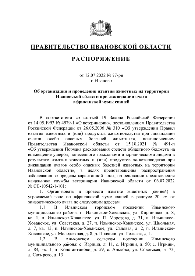 Распоряжение Правительства Ивановской области от 12.07.2022 N 77-рп "Об организации и проведении изъятия животных на территории Ивановской области при ликвидации очага африканской чумы свиней"