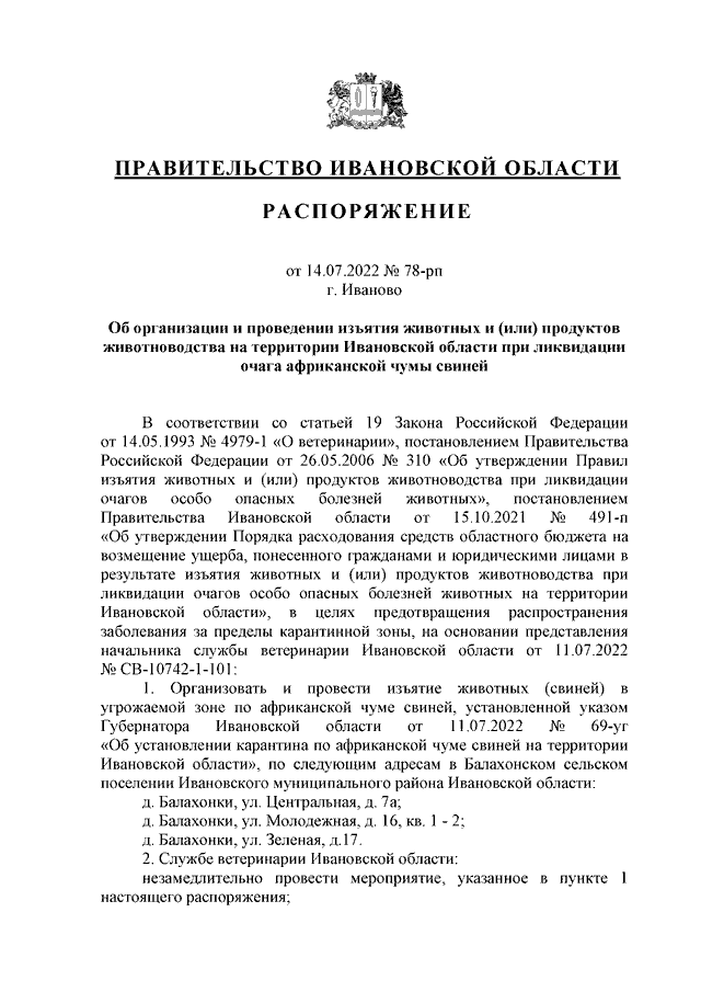Распоряжение Правительства Ивановской области от 14.07.2022 N 78-рп "Об организации и проведении изъятия животных и (или) продуктов животноводства на территории Ивановской области при ликвидации очага африканской чумы свиней"