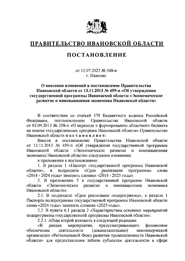 Постановление Правительства Ивановской области от 12.07.2022 N 348-п "О внесении изменений в постановление Правительства Ивановской области от 13.11.2013 N 459-п "Об утверждении государственной программы Ивановской области "Экономическое развитие и инновационная экономика Ивановской области"