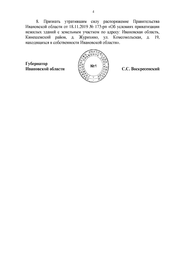 Распоряжение Правительства Ивановской области от 27.07.2022 N 85-рп "Об условиях приватизации нежилых зданий с земельным участком по адресу: Ивановская область, Кинешемский район, д. Журихино, ул. Комсомольская, д. 19, находящихся в собственности Ивановской области"