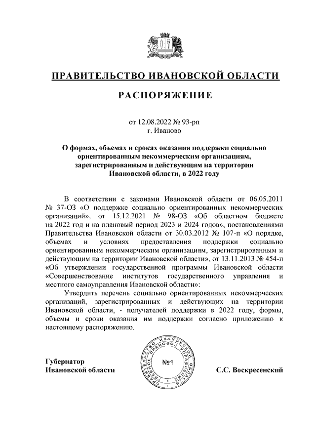 Распоряжение Правительства Ивановской области от 12.08.2022 N 93-рп "О формах, объемах и сроках оказания поддержки социально ориентированным некоммерческим организациям, зарегистрированным и действующим на территории Ивановской области, в 2022 году" (вместе с "Перечнем социально ориентированных некоммерческих организаций, зарегистрированных и действующих на территории Ивановской области, - получателей поддержки в 2022 году, формами, объемами и сроками оказания им поддержки")