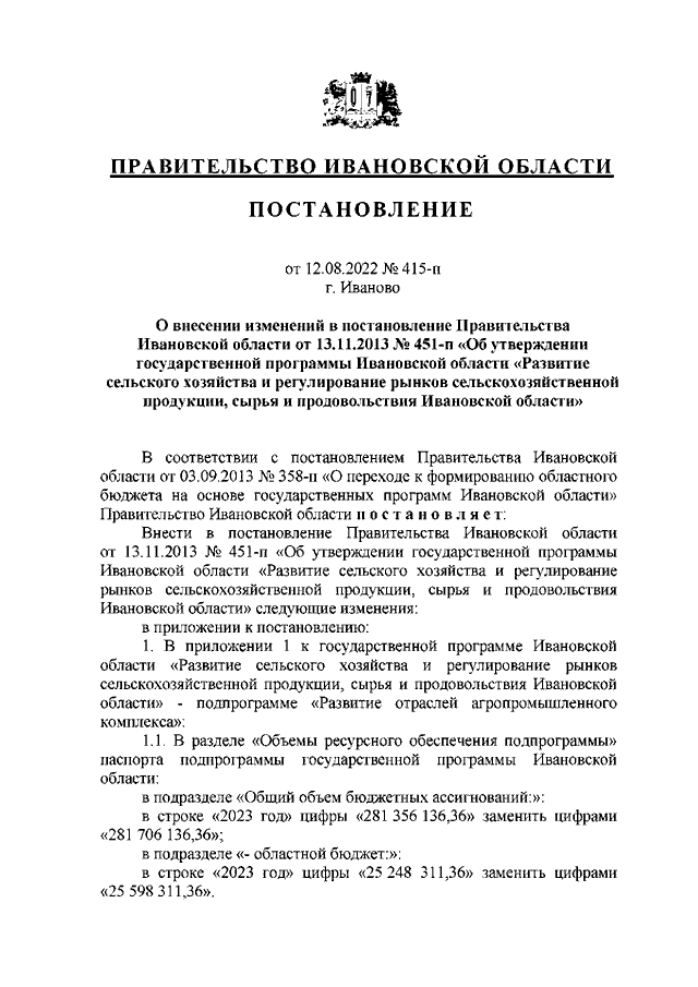Постановление Правительства Ивановской области от 12.08.2022 N 415-п "О внесении изменений в постановление Правительства Ивановской области от 13.11.2013 N 451-п "Об утверждении государственной программы Ивановской области "Развитие сельского хозяйства и регулирование рынков сельскохозяйственной продукции, сырья и продовольствия Ивановской области"