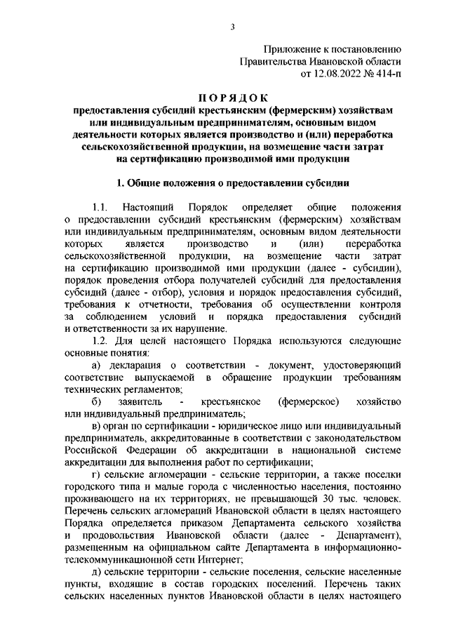 Постановление Правительства Ивановской области от 12.08.2022 N 414-п "Об утверждении Порядка предоставления субсидий крестьянским (фермерским) хозяйствам или индивидуальным предпринимателям, основным видом деятельности которых является производство и (или) переработка сельскохозяйственной продукции, на возмещение части затрат на сертификацию производимой ими продукции"