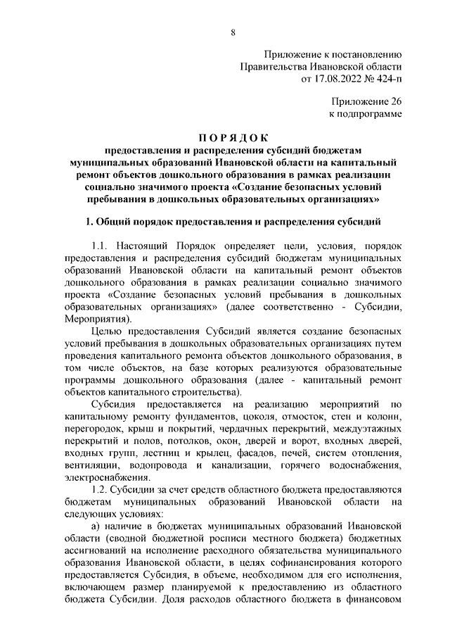 Постановление Правительства Ивановской области от 17.08.2022 N 424-п "О внесении изменений в постановление Правительства Ивановской области от 13.11.2013 N 450-п "Об утверждении государственной программы "Развитие образования Ивановской области" (вместе с "Порядком предоставления и распределения субсидий бюджетам муниципальных образований Ивановской области на капитальный ремонт объектов дошкольного образования в рамках реализации социально значимого проекта "Создание безопасных условий пребывания в дошкольных образовательных организациях")