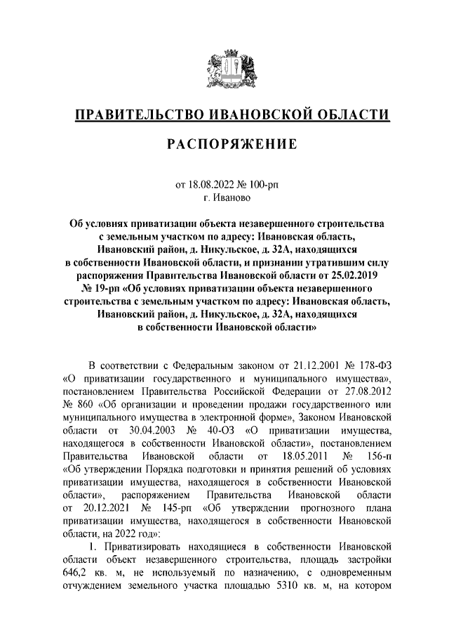 Распоряжение Правительства Ивановской области от 18.08.2022 N 100-рп "Об условиях приватизации объекта незавершенного строительства с земельным участком по адресу: Ивановская область, Ивановский район, д. Никульское, д. 32А, находящихся в собственности Ивановской области, и признании утратившим силу распоряжения Правительства Ивановской области от 25.02.2019 N 19-рп "Об условиях приватизации объекта незавершенного строительства с земельным участком по адресу: Ивановская область, Ивановский район, д. Никульское, д. 32А, находящихся в собственности Ивановской области"
