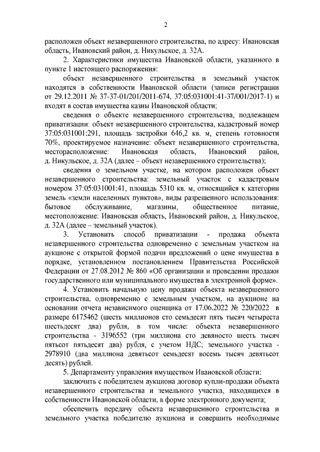 Распоряжение Правительства Ивановской области от 18.08.2022 N 100-рп "Об условиях приватизации объекта незавершенного строительства с земельным участком по адресу: Ивановская область, Ивановский район, д. Никульское, д. 32А, находящихся в собственности Ивановской области, и признании утратившим силу распоряжения Правительства Ивановской области от 25.02.2019 N 19-рп "Об условиях приватизации объекта незавершенного строительства с земельным участком по адресу: Ивановская область, Ивановский район, д. Никульское, д. 32А, находящихся в собственности Ивановской области"