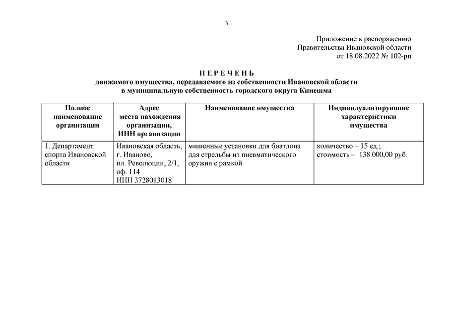 Распоряжение Правительства Ивановской области от 18.08.2022 N 102-рп "О передаче движимого имущества из собственности Ивановской области в муниципальную собственность городского округа Кинешма"