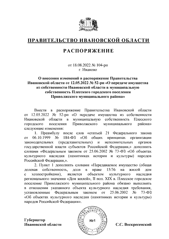 Распоряжение Правительства Ивановской области от 18.08.2022 N 104-рп "О внесении изменений в распоряжение Правительства Ивановской области от 12.05.2022 N 52-рп "О передаче имущества из собственности Ивановской области в муниципальную собственность Плесского городского поселения Приволжского муниципального района"