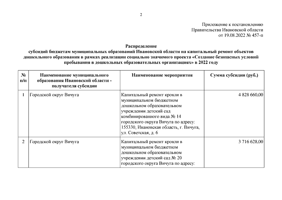 Постановление Правительства Ивановской области от 19.08.2022 N 457-п "О распределении субсидий бюджетам муниципальных образований Ивановской области на капитальный ремонт объектов дошкольного образования в рамках реализации социально значимого проекта "Создание безопасных условий пребывания в дошкольных образовательных организациях" в 2022 году"