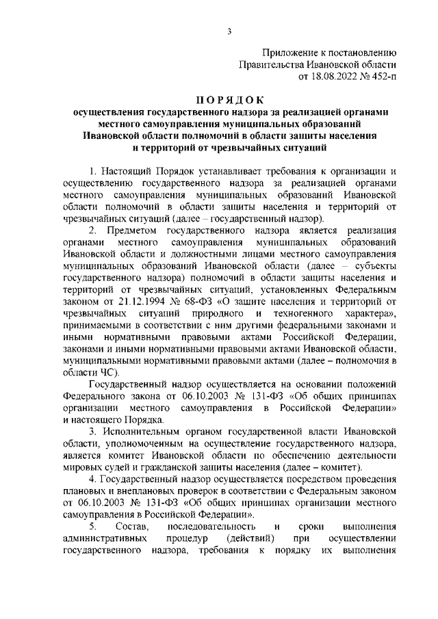 Постановление Правительства Ивановской области от 18.08.2022 N 452-п "О внесении изменений в постановление Правительства Ивановской области от 24.12.2018 N 402-п "Об утверждении Положения о комитете Ивановской области по обеспечению деятельности мировых судей и гражданской защиты населения" и об утверждении Порядка осуществления государственного надзора за реализацией органами местного самоуправления муниципальных образований Ивановской области полномочий в области защиты населения и территорий от чрезвычайных ситуаций"