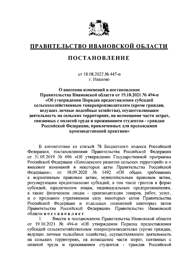 Постановление Правительства Ивановской области от 18.08.2022 N 447-п "О внесении изменений в постановление Правительства Ивановской области от 19.10.2021 N 494-п "Об утверждении Порядка предоставления субсидий сельскохозяйственным товаропроизводителям (кроме граждан, ведущих личные подсобные хозяйства), осуществляющим деятельность на сельских территориях, на возмещение части затрат, связанных с оплатой труда и проживанием студентов - граждан Российской Федерации, привлеченных для прохождения производственной практики"