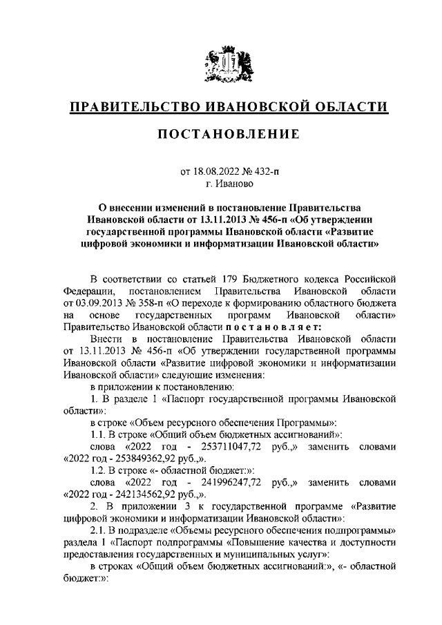 Постановление Правительства Ивановской области от 18.08.2022 N 432-п "О внесении изменений в постановление Правительства Ивановской области от 13.11.2013 N 456-п "Об утверждении государственной программы Ивановской области "Развитие цифровой экономики и информатизации Ивановской области"