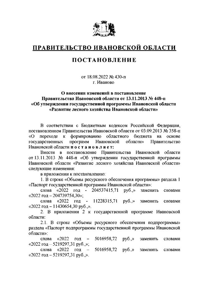 Постановление Правительства Ивановской области от 18.08.2022 N 430-п "О внесении изменений в постановление Правительства Ивановской области от 13.11.2013 N 448-п "Об утверждении государственной программы Ивановской области "Развитие лесного хозяйства Ивановской области"